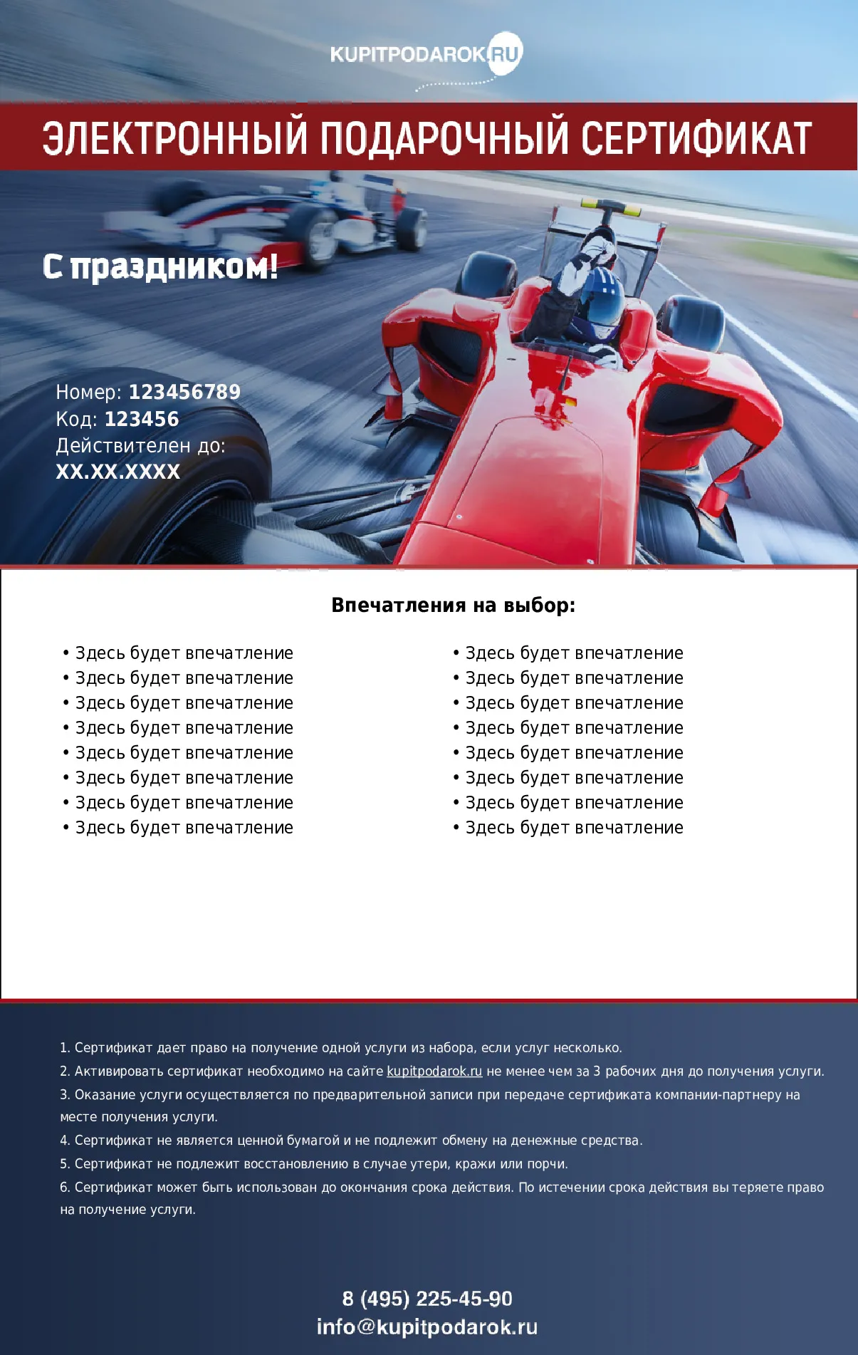 Получатель подарка выбирает одно из предложенных впечатлений. Ничего доплачивать не нужно.