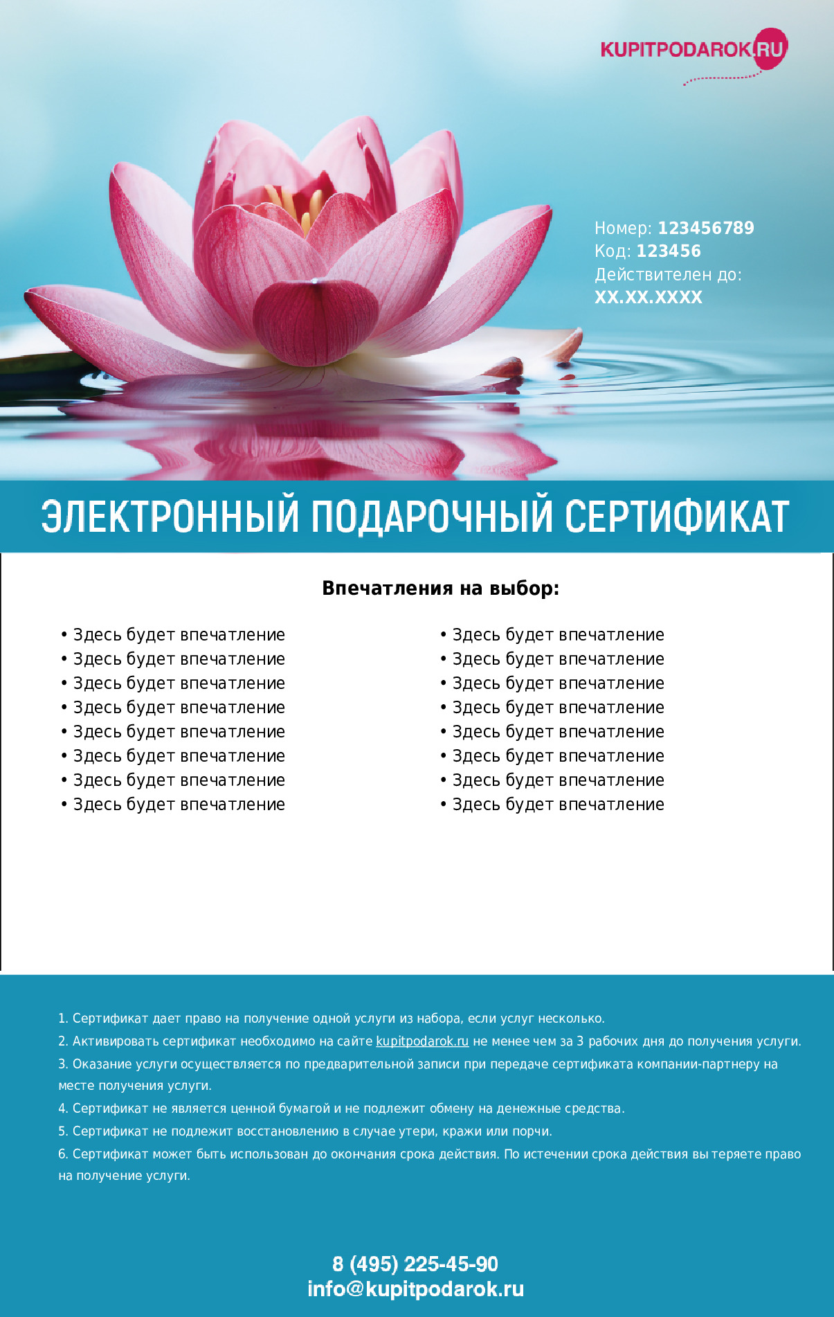 Сертификат неименной, поэтому при оформлении заказа лучше указать свои данные, в том числе электронную почту. Именно на указанную почту придет письмо с чеком об оплате и письмо с сертификатом.