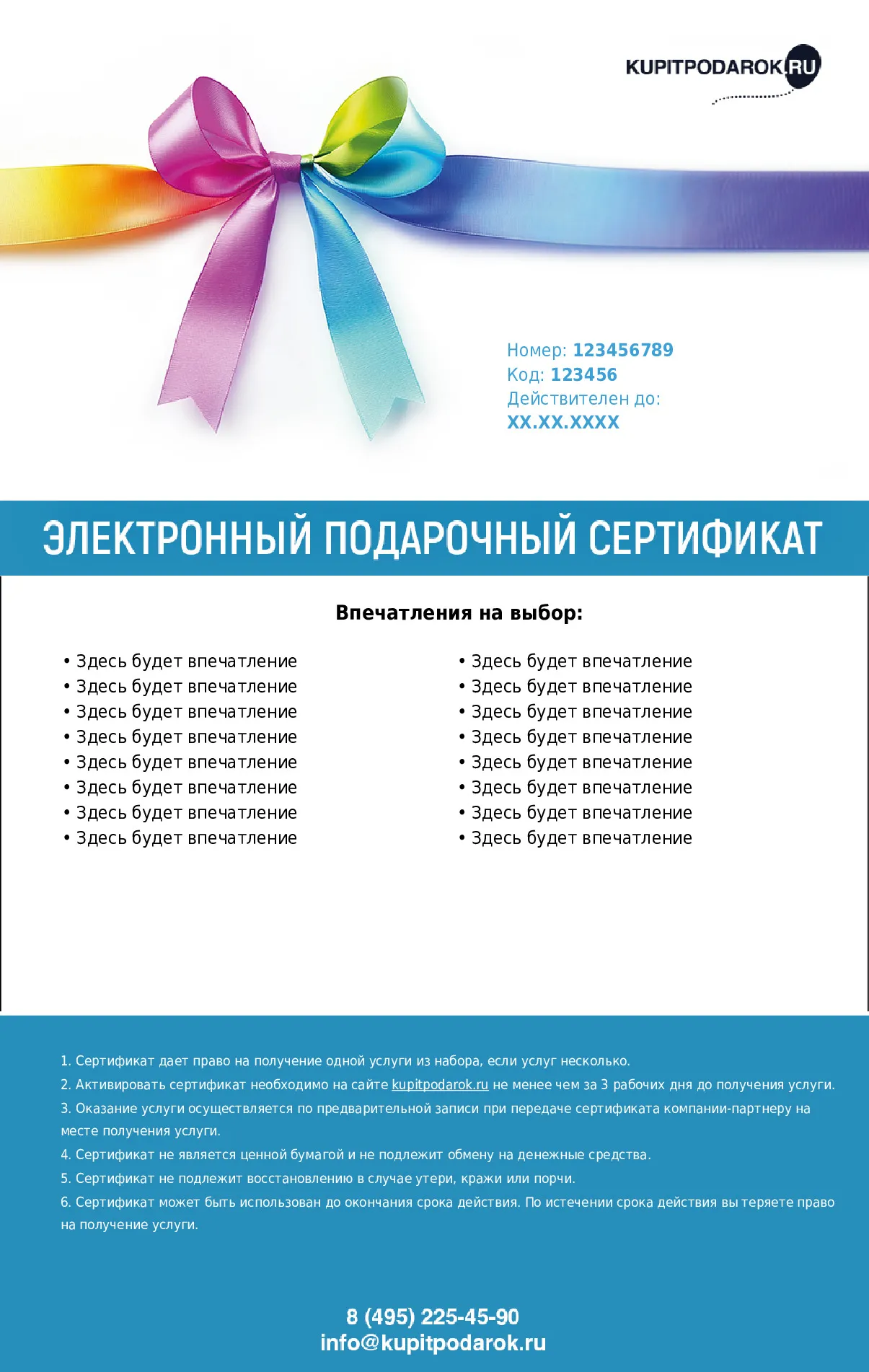 Получатель подарка выбирает одно из предложенных впечатлений. Ничего доплачивать не нужно.