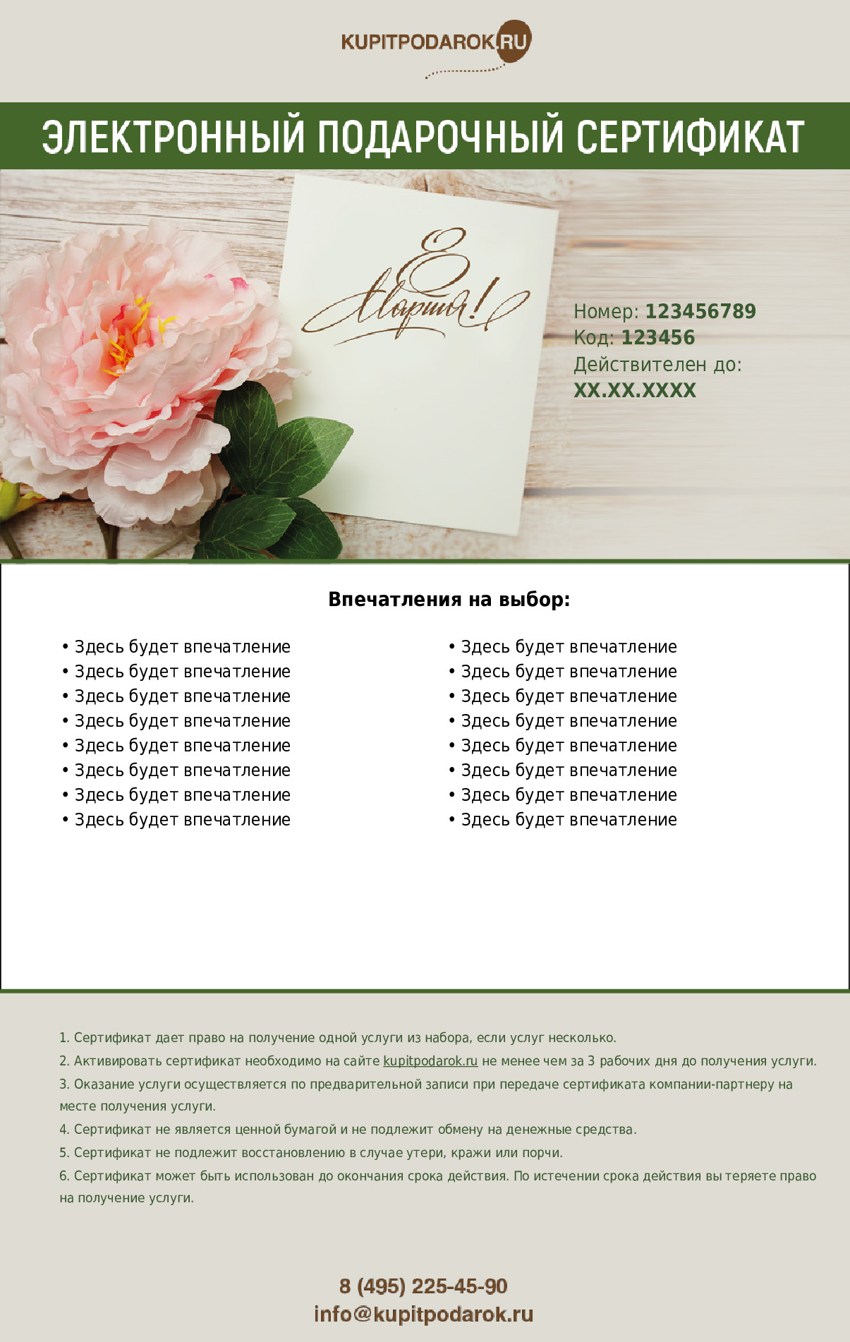 Использовать сертификат необходимо в рамках срока его действия (1 год с момента продажи), который будет указан на самом сертификате.